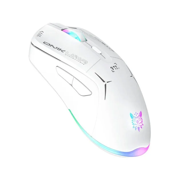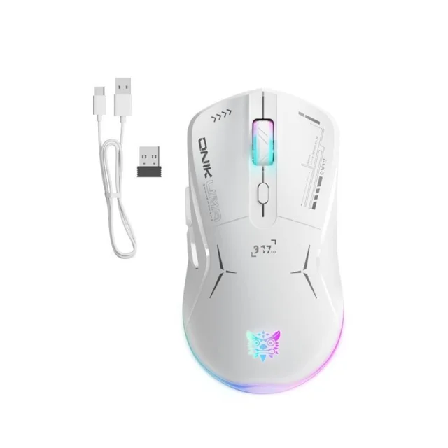 این موس گیمینگ دو حالته بیسیم و باسیم فوق العاده و اقتصادی از برند اونیکوما، ترکیبی از طراحی ارگونومیک و زیبایی بصری را به ارمغان می آورد. این موس از دو طریق دانگل 2.4GHZ بصورت بیسیم و کابل USB-C بصورت باسیم متصل میشود .در قسمت انتهایی موس و اسکرول، نورپردازی RGB به کار رفته که حس قدرت و هیجان گیمینگ را به کاربر منتقل میکند.
